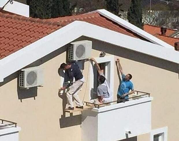 Безопасность лестницы предполагает наличие трех точек опоры. Три парня = три точки = безопасно, математика подтвердилась.