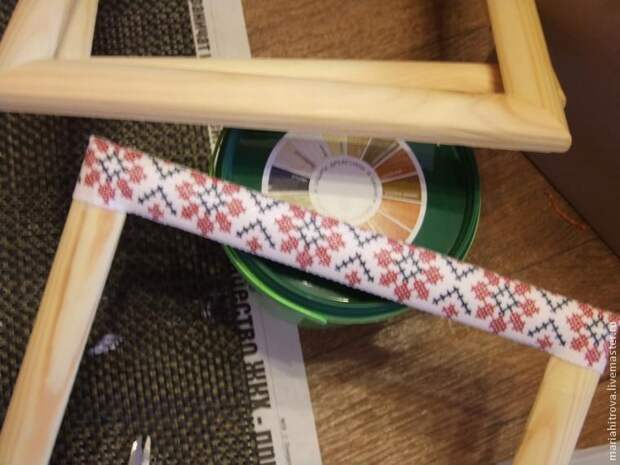 Это не столько для цвета, сколько для защиты дерева от влаги и жучков, т.к. у нас рамка будет висеть на даче.2. Отрезаем кусок ткани с рисунком для верхней части нашего окошка. Приклеиваем его к рамке с помощью простого ПВА клея (можно и декупажный клей использовать). Промазываем клеем 2-3 слоя и оставляем сохнуть.