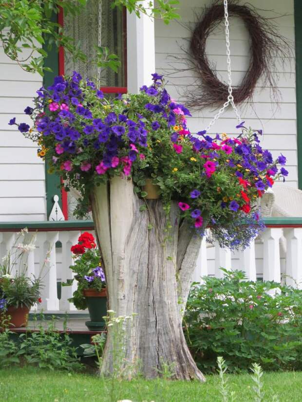 Если от срубленного дерева остался пень, который вы не решились выкорчевать, на нём можно устроить отличную клумбу! При помощи проволоки прикрепите к дереву горшки с растениями. Старайтесь выбирать цветы с красивыми ниспадающими побегами, которые задекорируют кашпо.