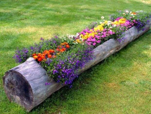 Приспособить под клумбу можно и такие предметы, которые лежат прямо под открытым небом. Например, бревно давно спиленного дерева. По всей длине ствола вырежьте небольшое углубление и посадите туда любимые цветы.