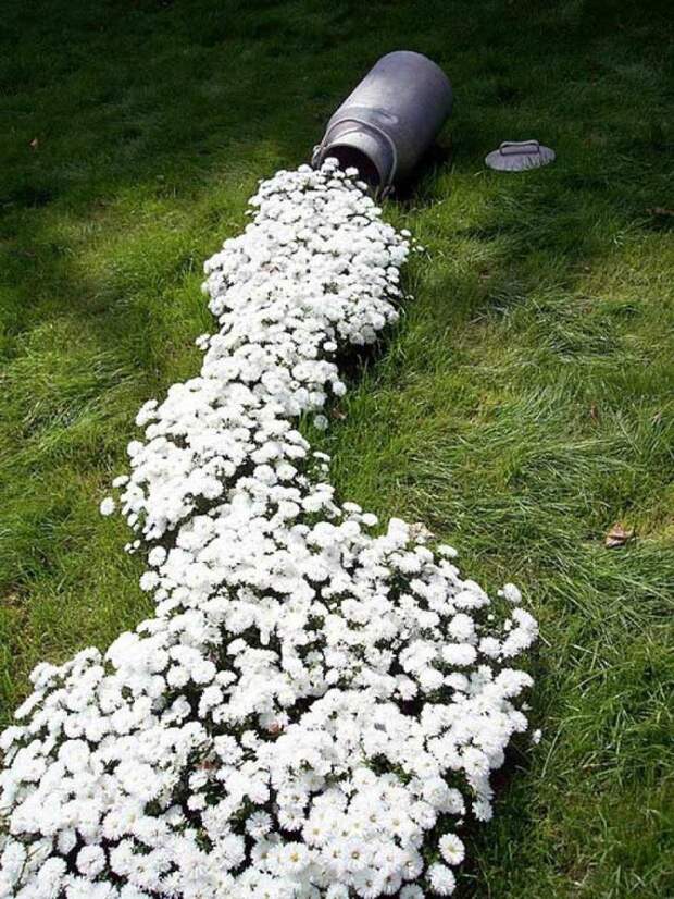 Эта цветочная дорожка — словно молочная река, которая вылилась из бидона! В создании такой клумбы главное — однотонный зелёный фон.
