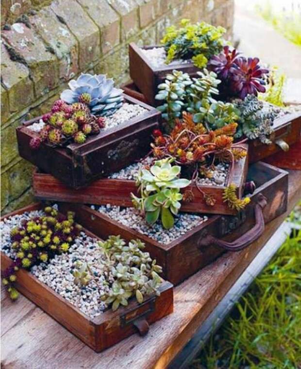 Небольшие ящики, оставшиеся от старых тумбочек, столиков, комодов и так далее, можно красиво расставить на дачном участке, организовав небольшую клумбу. Сами ящики и ручки на них могут отличаться по форме, размеру, цвету, стилистике. В этом случае цветы способны гармонично объединить все эти вещи.