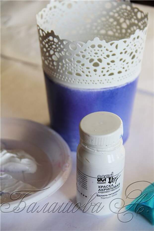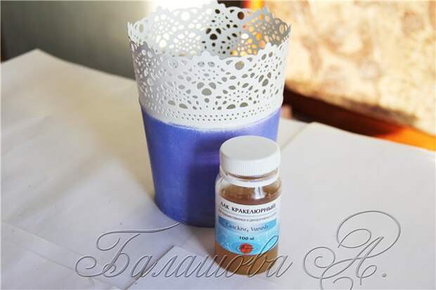 Я делаю это пальцем, аккуратно наносим кракелюр на всю окрашенную поверхность кашпо. Следим, чтобы не было подтеков.