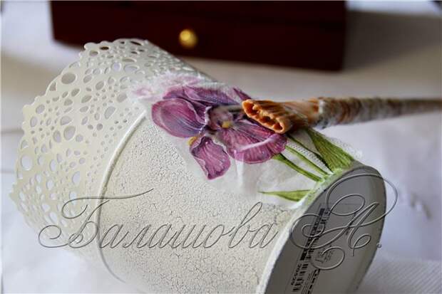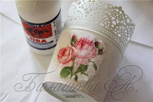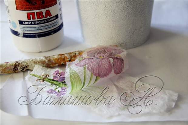 Приклеиваем мотив при помощи плоской синтетической кисти и клея ПВА. Аккуратно промазываем мотив от центра к краям, стараясь разглаживать, образовавшиеся складочки. Работаем аккуратно, чтобы не порвать салфетку. Оставляем сохнуть.