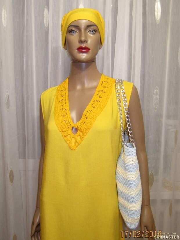 Следующий вариант – летнее платье или сарафан. Для создания нарядной и оригинальной модели потребуется 1-2 мотка хлопка и отрез ткани, равный длине вашего будущего изделия. Далее, ищем в интернете (или придумываем сами, кто умеет) схему вязания для создания верхней части. Она может быть любой формы: круглая, квадратная, фигурная или даже в виде широких ажурных шлеек. Работать лучше крючком, поскольку он незаменим для вязания летних ажуров. На фото с манекеном представлено летнее платье из хлопка и штапеля, которое я шила-вязала для себя, но могу и повторить))).