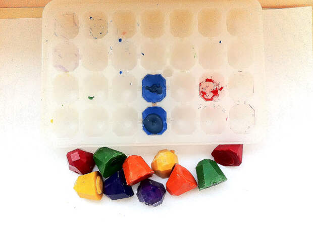 Поэтому мы насыпали мелки в старые ненужные силиконовые формы для маффинов и поставили их на противень в духовку на 180 градусов. Мелки расплавились быстро, минуты за 2 и превратились в жидкую субстанцию. Аккуратно достаем формы из духовки и аккуратно переливаем воск в формочки (у нас формочки для льда). Если у вас форма, в которой вы плавили мелки, сплошная, то разливаем воск по формочкам ненужной ложкой. ОЧЕНЬ ВАЖНО - когда воск разлит по формочкам для застывания, следует тщательно его размешать, чтобы удалить воздух, иначе у застывших мелков после застывания будут дырочки. Ставим формочку застывать в морозилку. Мелки застывают достаточно быстро. Достаем форму, крутим, стучим ею по столу, как будто хотим вынуть лед. Если мелки хорошо застыли, то они сами выпадут из формы без проблем. Откладываем их в сторону. Здесь позвольте важное отступление. Вообще у вас есть два варианта действий: 1. Залить первую половину воска для застывания, заморозить, достать половинки. Залить вторую половину воска в формы, пару минут дать подернуться пленкой и прижать сверху уже застывшие первые половинки