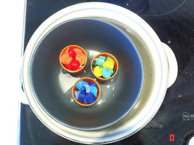 Высыпаем в формочки, кладем в емкость, а емкость погружаем в кастрюльку с водой (на водяную баню). Ждем, когда мелки расплавятся. Мы не дождались))) У нас они долго совсем не плавились!