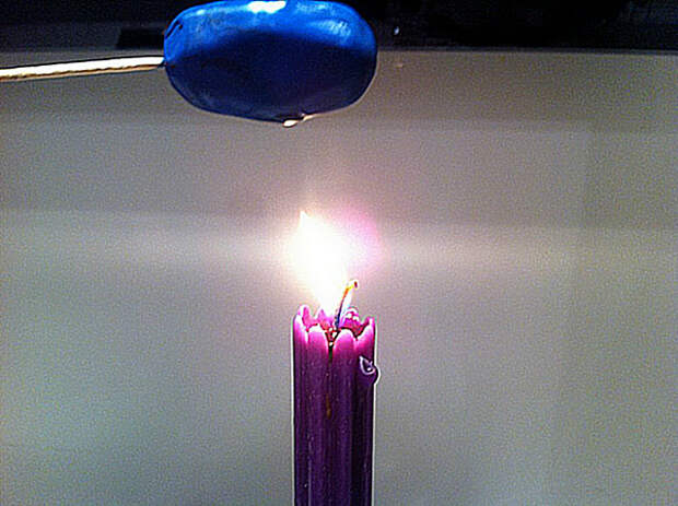 2. Сразу залить весь имеющийся воск, а потом соединить половинки над пламенем свечи. Я начала с варианта №1 и в итоге хорошо и крепко склеились только 4 мелка (!) из 15. Так что я так или иначе перешла к варианту №2 и могу сказать, что имеет смысл сразу начинать с него - это и быстрее и наверняка (если вы тоже делаете в похожей форме для льда). Продолжаем. Берем ненужную свечку (она потом вся будет в разноцветном воске), устанавливаем на какой-нибудь площадке, все вокруг застилаем бумагой для защиты от воска. Берем в руки две половинки мелка, подносим с двух сторон к пламени свечи, ждем, когда воск начнет немного плавиться и крепко прижимаем половинки друг к другу. Откладываем подсохнуть. Затвердевший мелок насаживаем на зубочистку, только хорошо насаживаем (немного расплавив кончик мелка), а то в самый ответственный момент мелок, простите, шмякнется лепешкой об пол! Мелок держим не как на фото, а в максимально высокой точке НАД пламенем свечи, когда начнет плавится воск. Если опустить мелок на миллиметр ниже допустимого, воск покапает чрезвычайно быстро, а на мелке останется черный нагар. Начинаем вертеть мелок за зубочистку вокруг своей оси, как на вертеле)) При этом "голова" мелка смотрит под углом вниз, так, чтобы воск медленно спускался от зубочистки к верхушке мелка. Свободной рукой сглаживаем неровности, особенно место соединения половинок.
