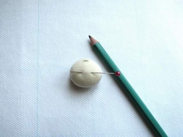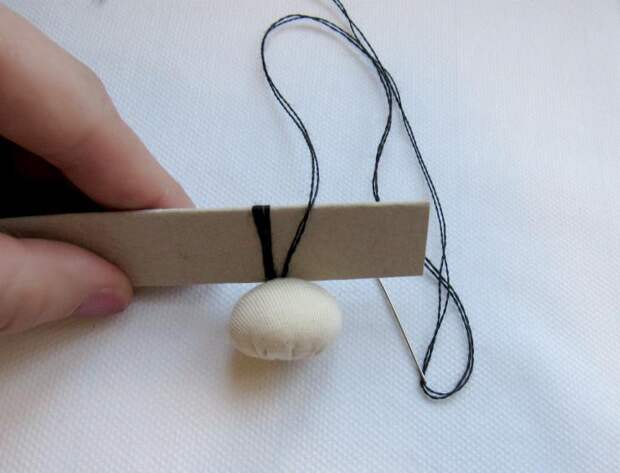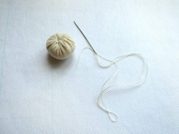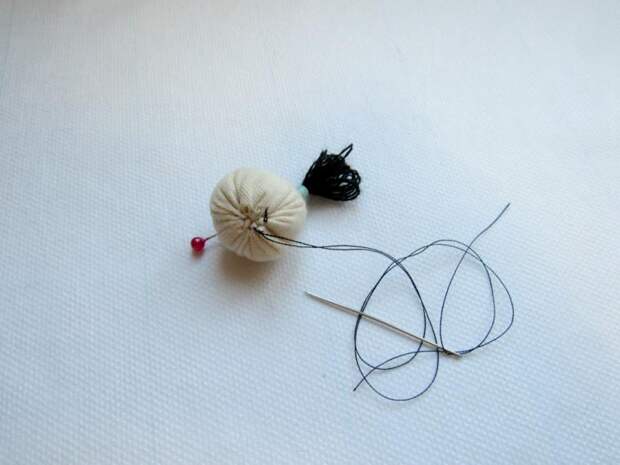 Набиваем и затягиваем наш шарик-голову, можно проложить пару дополнительных затяжных рядов для прочности и изящества формы.