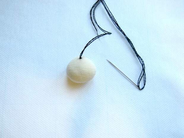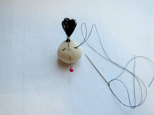 Отмечаем центр булавкой. Делаем глазки с закрепками и ноздри. Важно: все нитки выводим вниз, в, так сказать, точку сборки, там же делаем все закрепки.