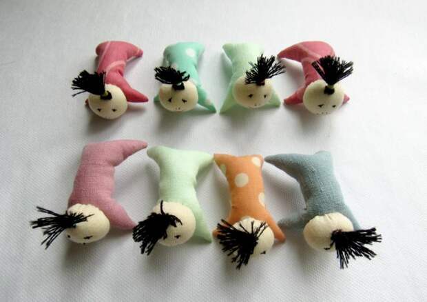 Сажаем малышей за "стол". Делаем закрепки в цвет. Важно: закрепки надо делать симметрично каждому малышу, чтобы не было перекоса.