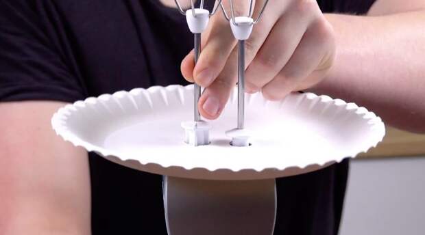 Через это проходил каждый, кто впервые пытался замесить тесто с помощью миксера! Добавляем какао... И вот шоколадная пыль уже разлетается по всей кухне. Чтобы это не произошло, нам нужна обычная бумажная тарелка. Проделываем в ней 2 отверстия для венчиков, вставляем, и можно начинать. Теперь ингредиенты надежно накрыты тарелкой.