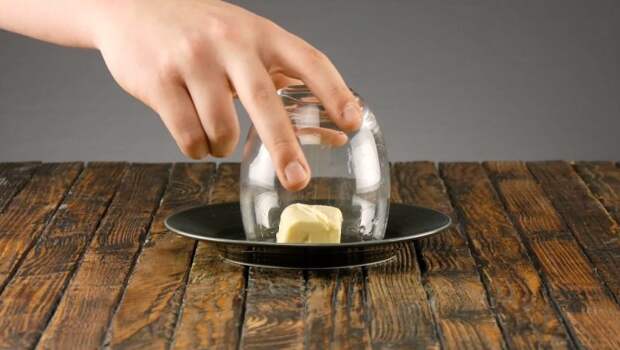 Ой, забыли заранее вынуть масло их холодильника, а в рецепте указано, что масло должно быть мягким. Не беда! Наливаем в стакан кипяток, а затем выливаем и накрываем еще горячим стаканом наше масло. Через минуту оно станет мягким.