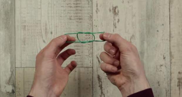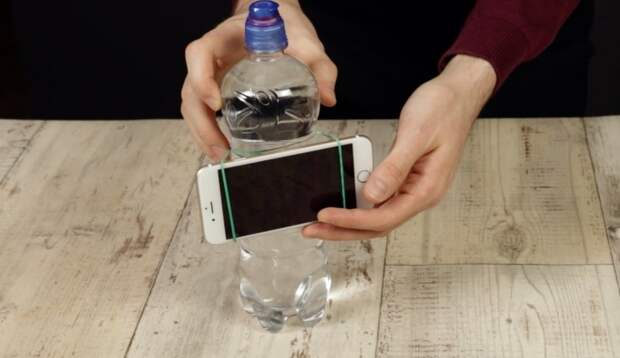 Чтобы удобно было смотреть видео на смартфоне, его можно закрепить, например, на бутылке с водой при помощи резинки. Перекручиваем резинку в середине, в затем петли с обоих концов набрасываем на смартфон. Теперь никуда не денется.