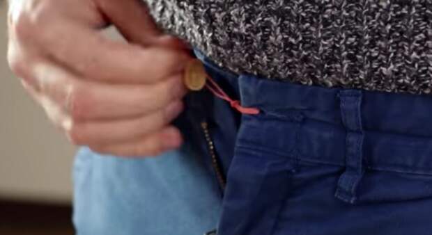 Если после плотного ужина штаны вам стали великоваты, а переставить пуговицу нет возможности, избежать конфуза поможет тонкая и прочная резинка. Просто продеваем ее через петлю и накидываем на пуговицу. Готово!