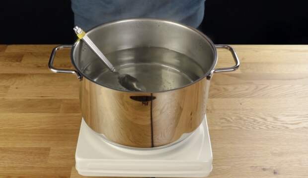 Помешали ложкой содержимое кастрюльки, прислонили ложку к краю - и вот ее уже не достать из кипящей воды.