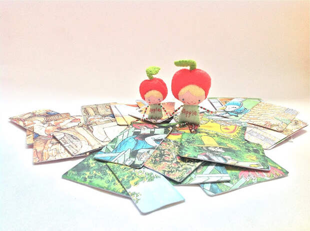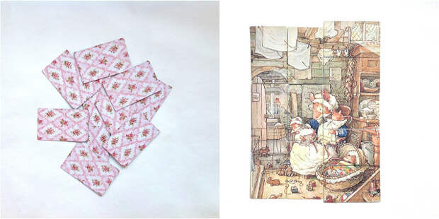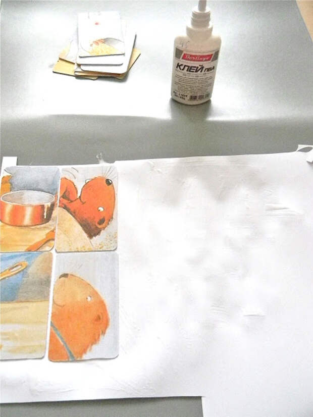 Когда клей немного подсохнет, берем пазлы, отрезаем маникюрными ножницами лишнюю бумагу по бокам карточек. Для того, чтобы пазлы не обтрепались по краям, эти края нужно обработать защитным, финишным или любым другим лаком. Я использовала матовый клей-лак для декупажа