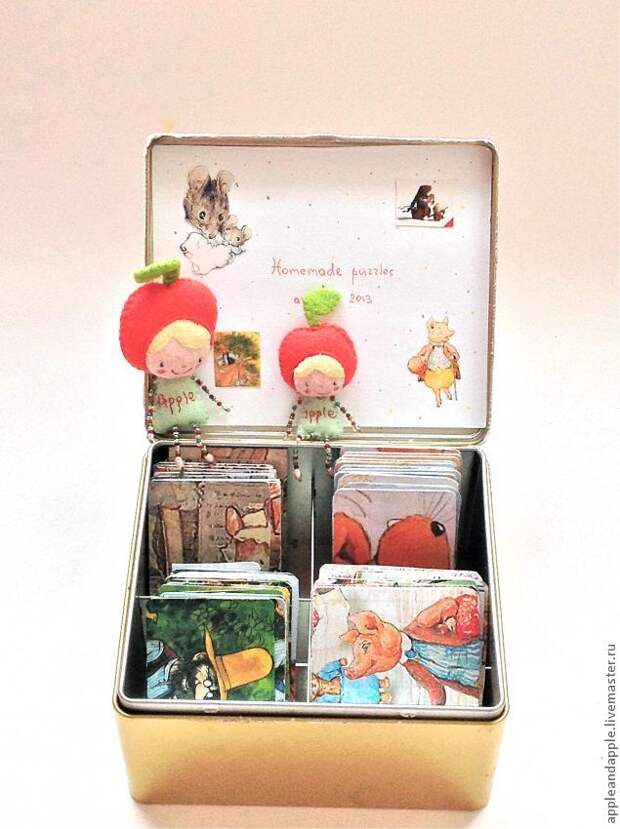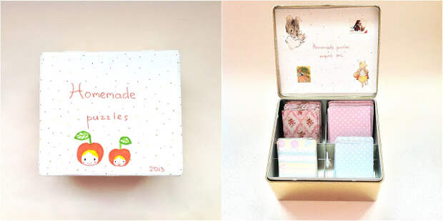 Пока пазлы сохнут, вы можете заняться подготовкой емкости, в которой пазлы будут храниться. Это могут быть мешочки, коробочки, корзинки и пр. Я взяла жестяную коробку из-под чая, у нее как раз были перегородки. Для моих пазлов идеальный вариант. Крышку я обклеила с обеих сторон бумагой для акварели (на двусторонний скотч), нанесла фломастерами разноцветные точки, надпись и год создания. На внутреннюю сторону крышки я еще наклеила маленькие картинки героев пазлов. Можно дать ребенку самому украсить коробку