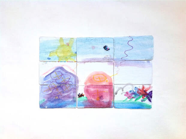 Ну и конечно, самые ценные пазлы для меня - Ульянины! Я наклеила на обычную белую самоклеющуюся бумагу для детского творчества карточки вышеописанным способом и Ульяна сама разрисовала бумагу. Картина под названием "Природа" ;-) Эти пазлы я покрыла универсальным защитным лаком. И вы обязательно дайте своим детям нарисовать свои собственные пазлы.
