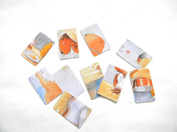 это может быть распечатка на цветном принтере, фотография, картинка из журнала и пр. Я нашла в Интеренете картинки с любимыми Ульяниными героями книг и распечатала их на заказ на НЕПРОЗРАЧНОЙ самоклеящейся бумаге. Эту услугу осуществляют многие фотофирмы, но нужно подобрать картинку, качество которой будет подходить для печати. Мне такие картинки распечатала мастер с ЯМ - 4 картинки рфомата А4 за 250 рублей. Если у вас есть цветной принтер, то вы сами можете распечатать картинки, купив самоклеющуюся бумагу, например фирмы "LOMOND" . Напомню, что бумага должна быть НЕПРОЗРАЧНАЯ, иначе будут просвечиваться надписи на карточках.Я сделала 4 комплекта пазлов. МК будет на примере одних из самых любимых наших с Ульяной героев - творческих умельцев Кастора и Фриппе (думаю, все их знают, а если кто-то не знает(!), то караул срочно купите ребенку все книги Ларса Клинтинга:-)
