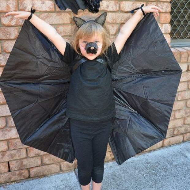 Когда об утреннике стало известно за ночь до него, а костюм деточке нужно сделать самим, на помощь придет старый зонт и ваши умелые ручки! Сделайте простой и эффектный карнавальный костюм с крыльями – на Хэллоуин или на утренник в детский сад. Полотно от старого зонтика аккуратно отделите от спиц, разрежьте пополам и пришейте к футболке подходящего цвета – и готово! Хоть летучая мышь, хоть ангел (зависит от цвета)!