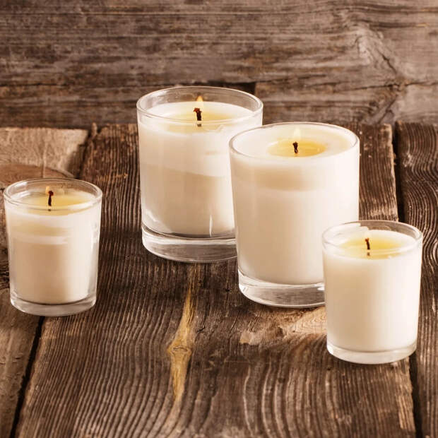 Стеклянные стаканы и баночки от покупных свечей можно использовать ещё не раз, чтобы сделать в них собственные свечи. Но перед этим нужно очистить стеклянную тару от остатков свечного воска.
