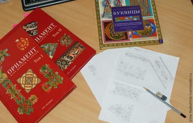 Готовый шкаф можно украсить орнаментом, рисунком, да чем угодно! Я хотела расписать горизонтальные перекладины растительным орнаментом. Начала поиск в книгах…