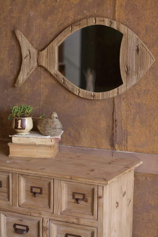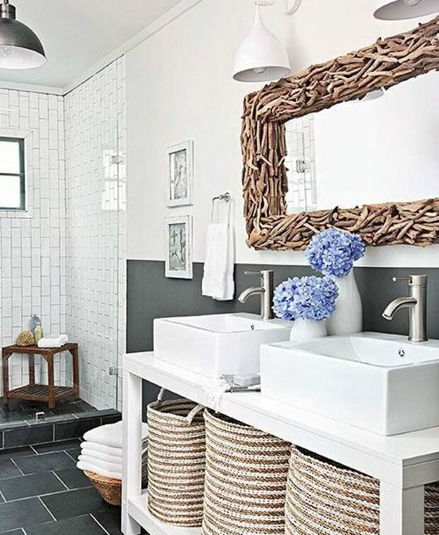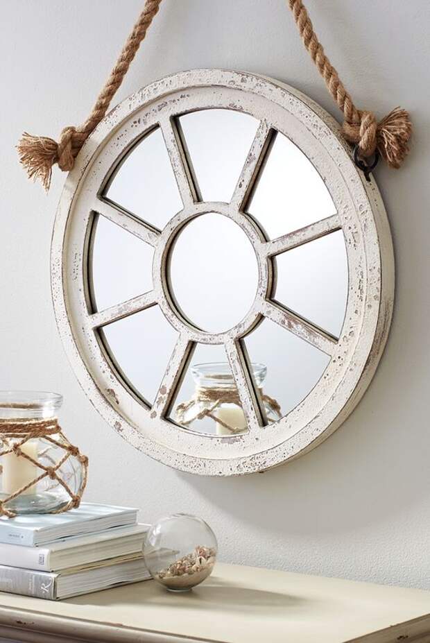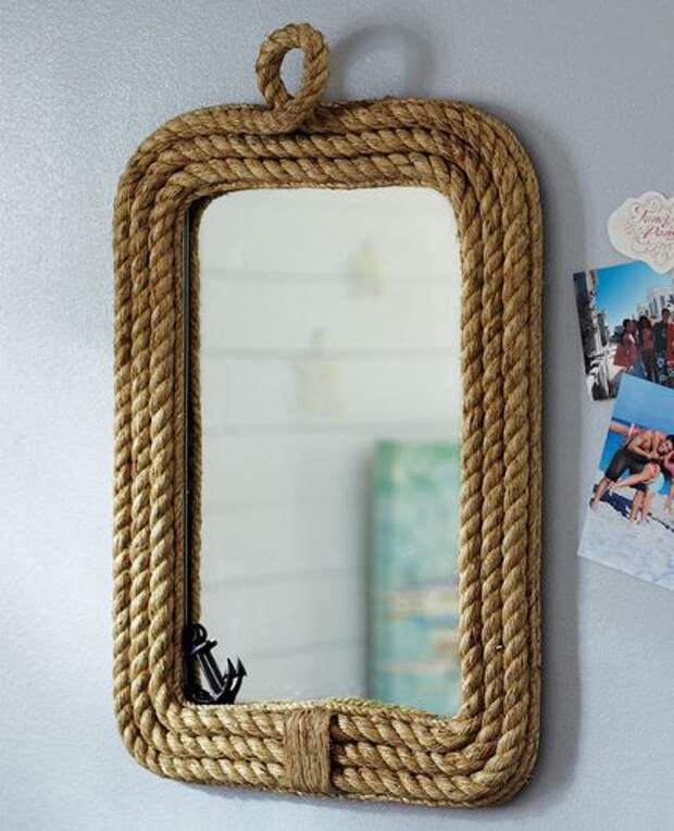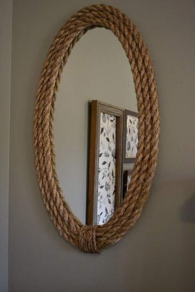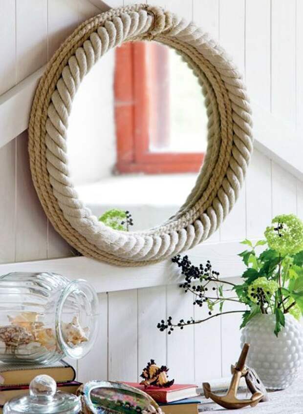Природной естественностью отличается интерьер, где в центре внимания находится зеркало в рамке, выполненной из канатной верёвки