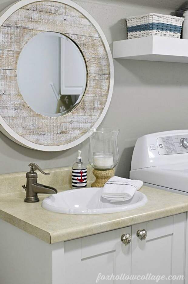 Зеркало в круглой раме с поперечными деревянными планками – оригинальное решение для ванной