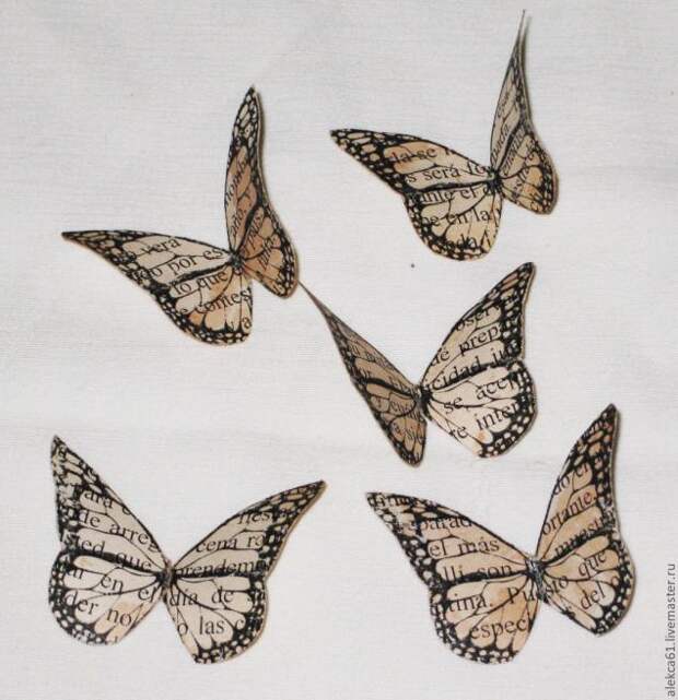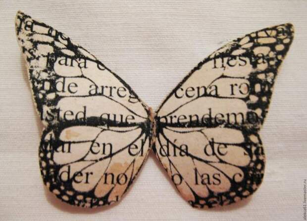 5) Вырезаем бабочек, погружаем ее в крепкий раствор чая, сушим. Высохнув, бабочки приобретают пикантные разводы. Складываем бабочку пополам и приклеиваем куда Вам надо.
