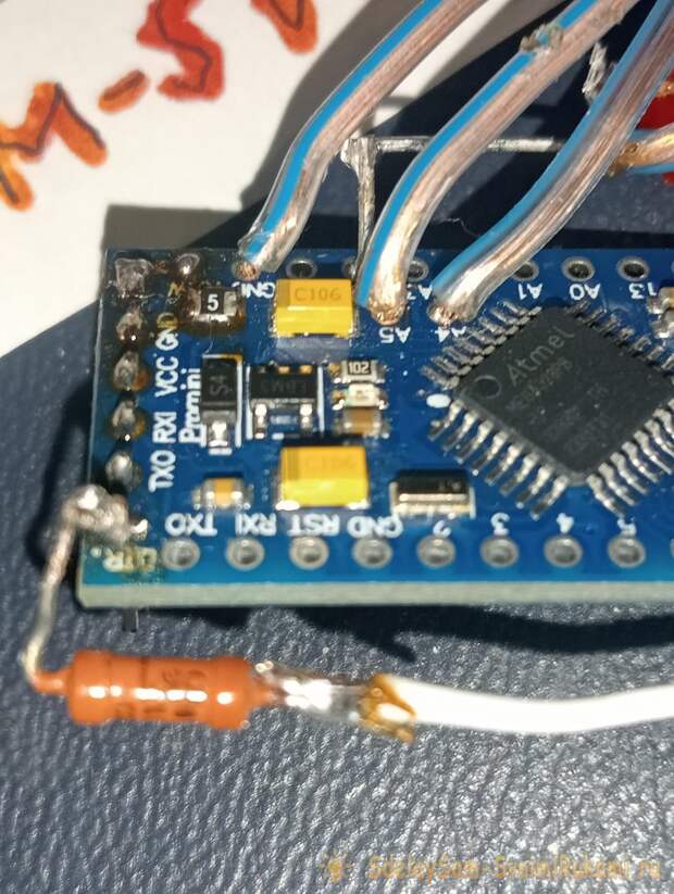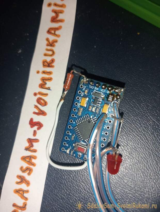 Обращу внимание, мне пришлаплата «pro mini»без разводки контакта «DTR», поэтому, для нормальной прошивки я соединил пин «DTR» через резистор к не земляному контакту кнопки сброса. Обычно это не нужно. Также подключил плюсовой вывод датчика через красныйсветодиод, на всякий случай, это тоже совершенно не обязательно.