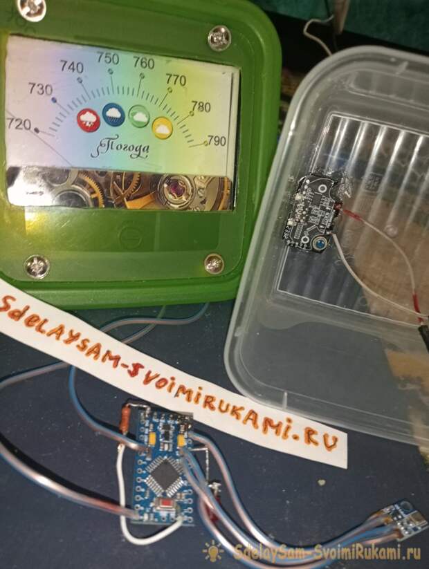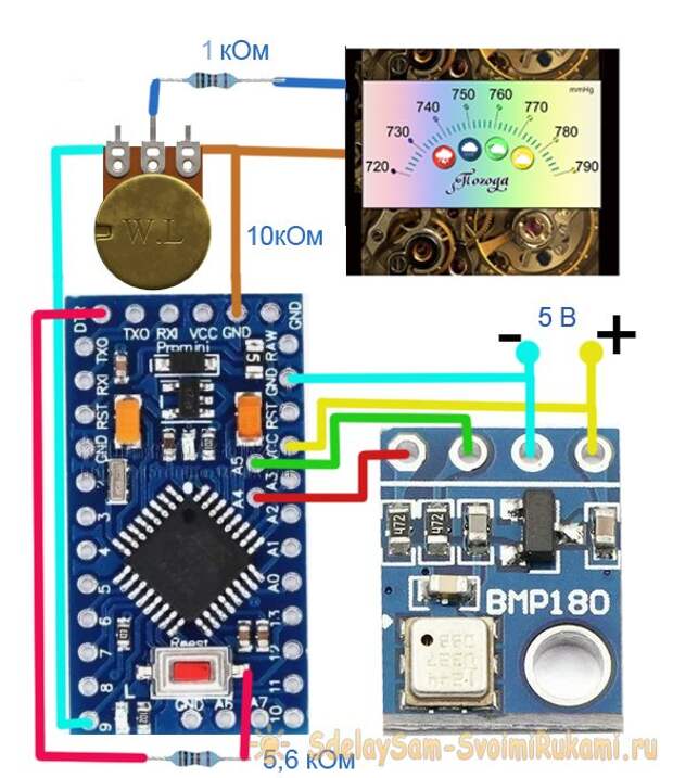 В конструкции будет использован очень точный датчик давления и температуры, с простым подключением по «I2C» интерфейсу к микроконтроллеру «ATMEGA 328» на базе бюджетной платформы «Arduino pro mini» имодуля атмосферного давления «GY-68»c выводом показаний на стрелочный вольтметр.