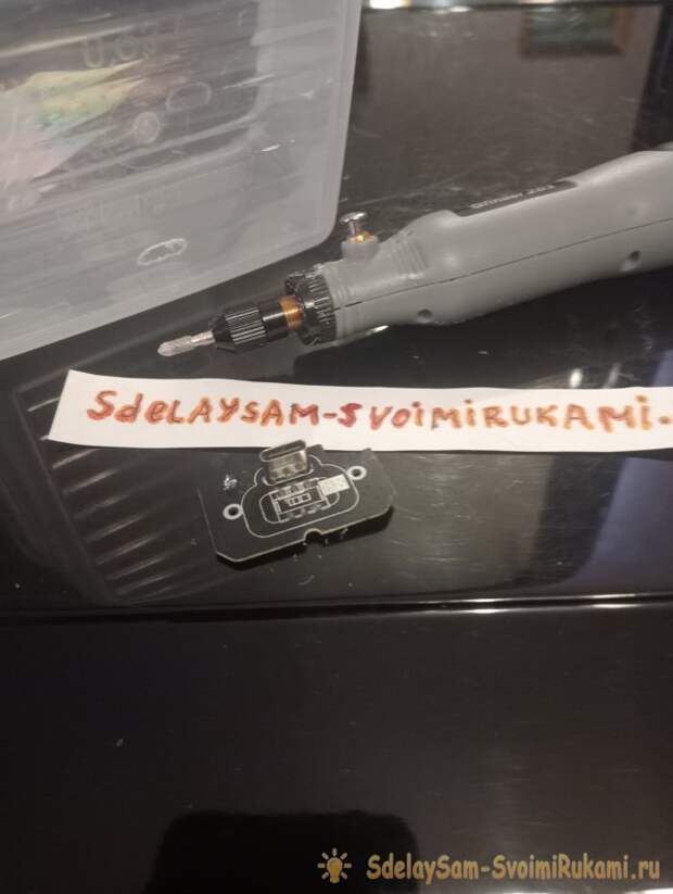 После просушки собираем измерительную головку, размечаем посадочное место и прорезаем крышку лотка. Это удобно делать дремелем.