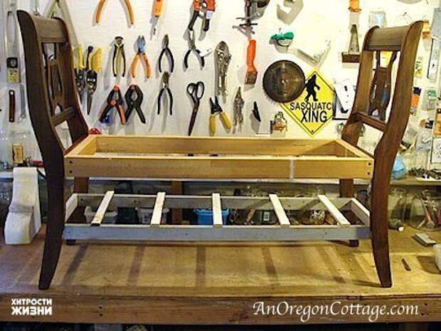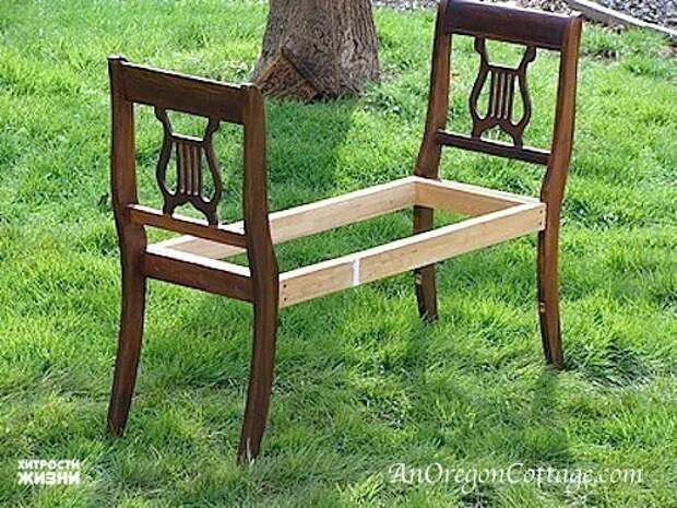 Собрать каркас такой длины какой вам видится ваша скамья и закрепить каждый конец двумя шурупами (как показано на рисунке выше). Используйте надежную древесину и длинные саморезы, потому что наша цель - создать крепкую и прочную конструкцию.