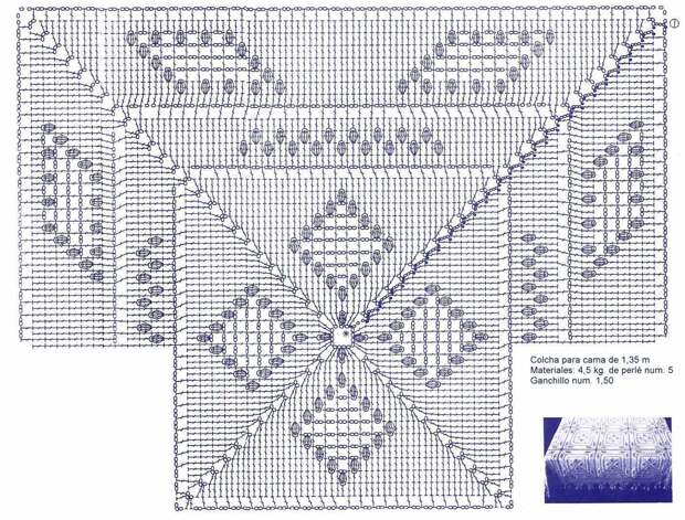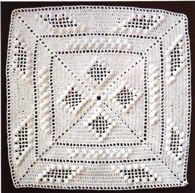 Но белый цвет самый оптимальный и нейтральный, подойдет для любого интерьера.Из таких же квадратов и такой же каймы можно связать не только скатерть, но и отличное покрывало на кровать или диван. А также из двух таких мотивов получится отличная диванная подушка.