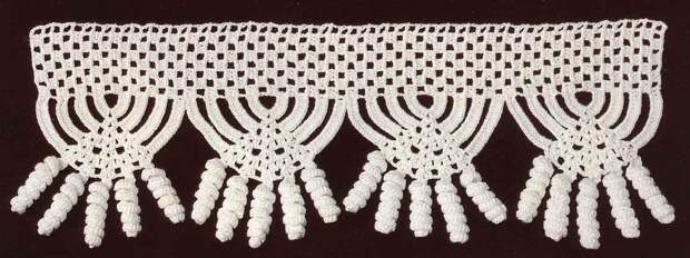 Белая скатерть из квадратных мотивов с ажурной каймой со спиральками.