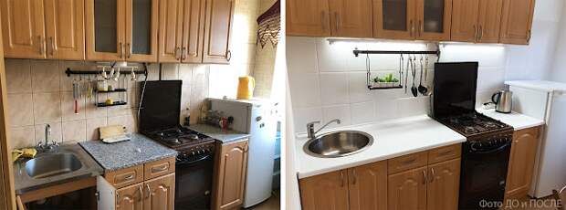 Банка краски за 500 рублей, новый светильник и белая столешница сотворили просто чудо. В такой кухне хочется проводить время, стало уютно и свежо.