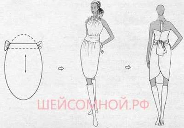 Замеряем обхват груди. Вырезаем полосу ткани длиной = обхвату груди и высотой 20 см. Собираем в складку по центру этой полоски, фиксируя длинной тесьмой из той же ткани, сзади по центру соединяем обе стороны этой полоски и сшиваем их, если ткань не тянется, то нужно вставить потайную молнию.