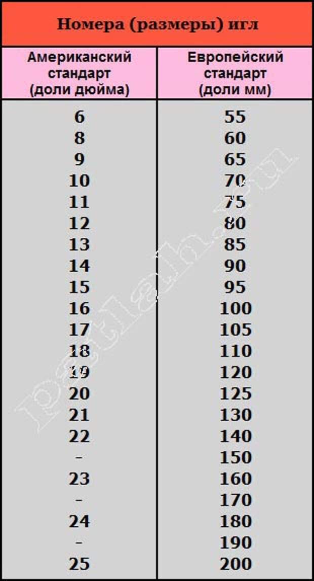 Номер, который указывается в названии иглы, обозначает ее толщину (диаметр) в сотых долях миллиметра или долях дюйма. Чем больше значение цифры, которой маркируется игла, тем она толще. Отдельные производители могут указывать сразу два значения, например 100/16 или 120/19. Это означает, что размер иглы указан в двух единицах измерения: в миллиметрах и в дюймах.