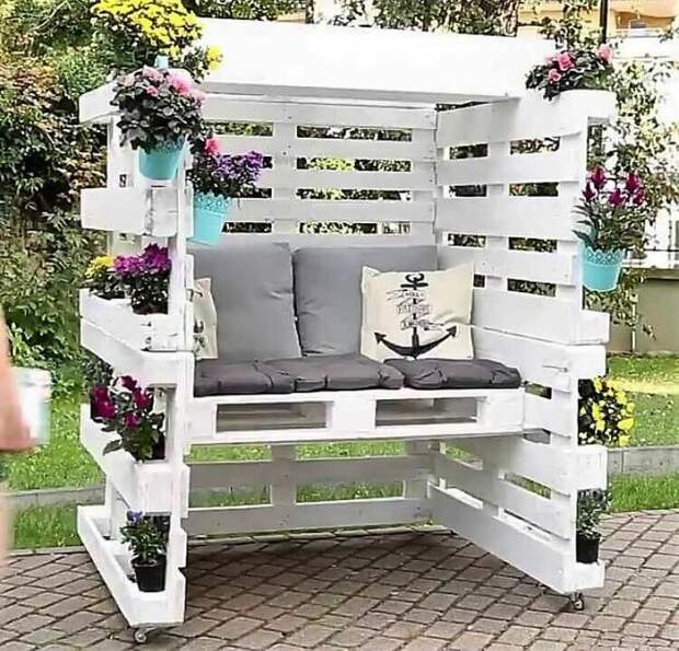Лучше сразу выкрасить краской паллеты. 2 поддона ставим параллельно относительно друг к другу на ширину поддона. Проводим доски в отверстия в середине паллет. Далее прибиваем горизонтально один поддон (для сидения). Потом формируем спинку, верх и боковые детали. Боковые стенки украсить цветочными горшками.