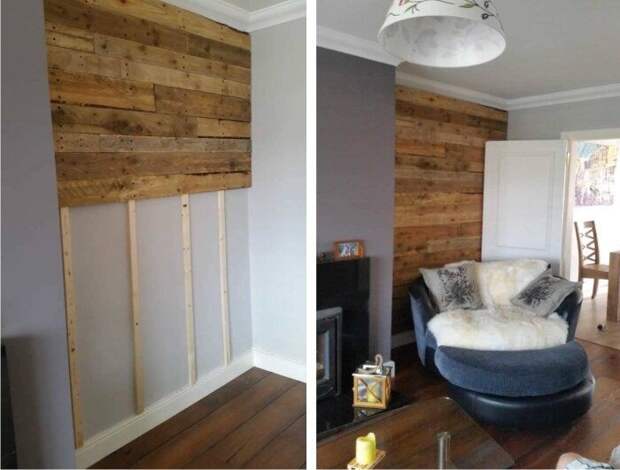 Чтобы доски ровно держались на стене, следует прибить основу - рейки по вертикали. На них и прибивать красивые досочки.