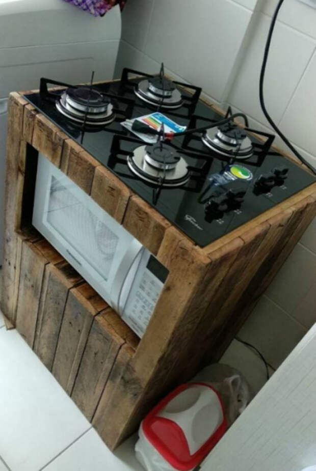 Самодельная кухонная тумба, сделанная из строительного поддона, отлично вписалась в интерьер кухни и стала отличной подставкой для варочной панели и микроволновой печи.
