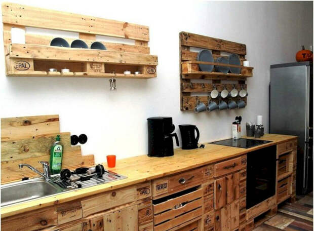 Немного разобранные и обрезанные, европоддоны в хорошем состоянии – практически готовые полки. Нужно лишь слегка облагородить их с помощью покраски, дополнить фурнитурой, повесить на стену и использовать для хранения посуды, чашек, кулинарных книг и других кухонных аксессуаров.