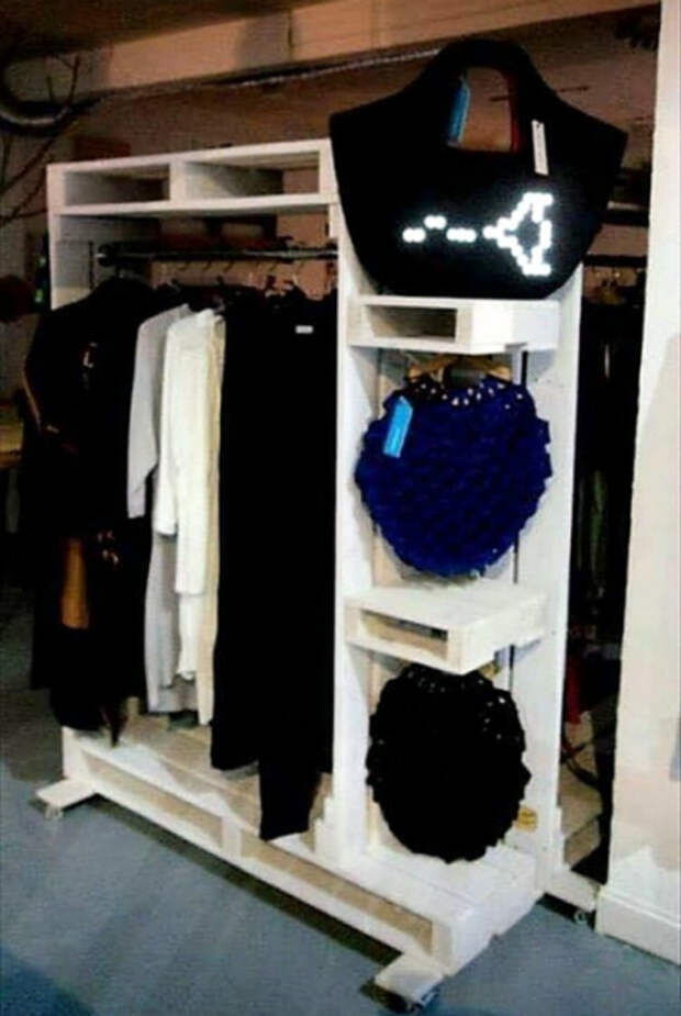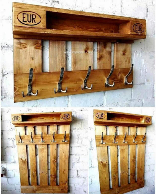 Еще один вариант использования поддонов с пользой для дома – сооружение вешалок в прихожую. Для того, чтобы сконструировать большую вешалку, понадобятся целые поддоны, а для маленькой достаточно будет половинки. Ну, и конечно, про крючки для одежды не забудьте.