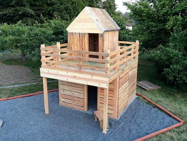 Отдельные доски или целые поддоны можно использовать для строительства целого игрового замка. Подобный можно построить во дворе или на загородном участке, правда придется приложить немало усилий.