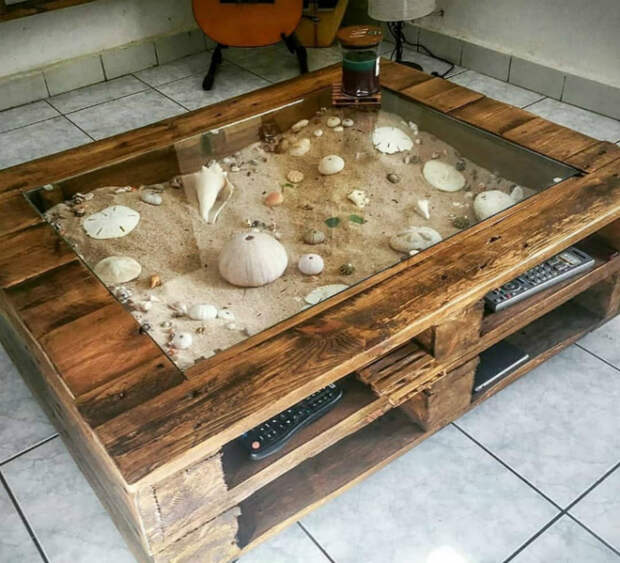 Этот журнальный столик – наглядный пример, доказывающий, что даже самые невзрачные, на первый взгляд, вещи можно превратить в настоящие дизайнерские шедевры. В данном конкретном случае кроме паллет использовали еще песок, ракушки и стекло.