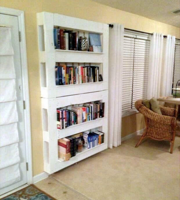 По нашему мнению, подобный стеллаж для книг – это простая конструкция, которая отлично впишется в интерьер даже самой маленькой комнаты. Смастерить его очень легко, нужно просто покрасить пару поддонов в любой светлый цвет и прикрепить к стене.