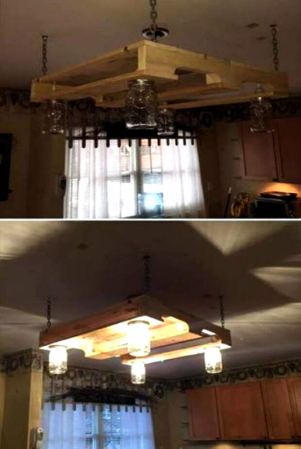 Массивный светильник, сделанный из поддона, стеклянных банок и цепей. Кому-то такой осветительный прибор покажется слишком грубым или простым, а кто-то увидит в нем нотки все еще популярного стиля лофт.