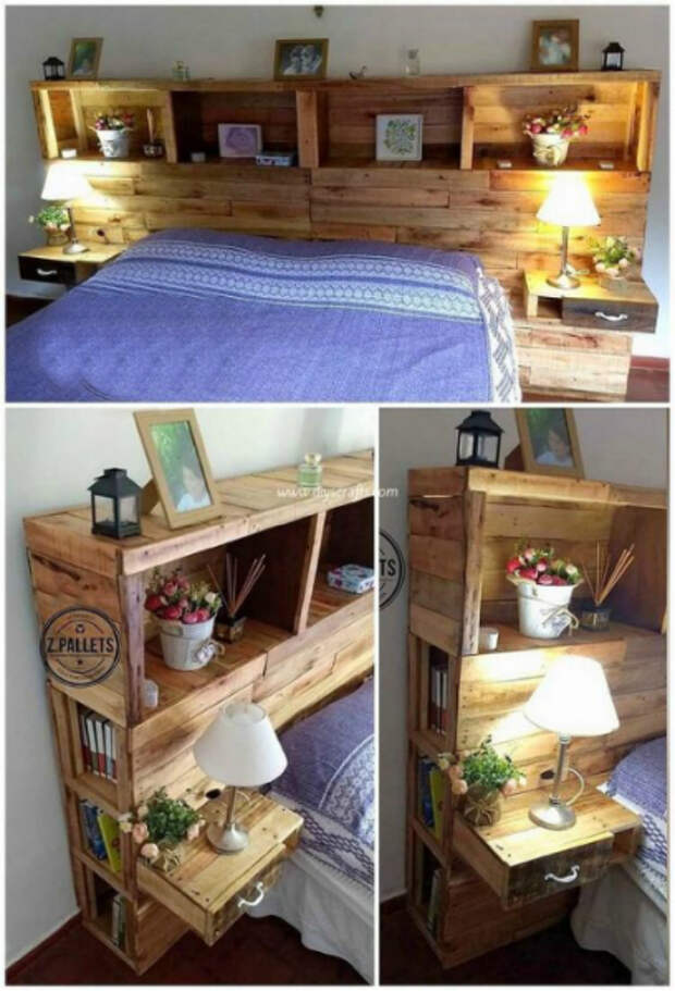 Из деревянных поддонов можно построить стильное и очень функциональное изголовье с полочками и навесными ящиками для хранения разнообразных мелочей.