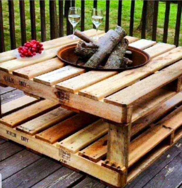Высокий очаг с каркасом из деревянных поддонов и металлической чашей – отличное решение для организации удобного места для посиделок у себя во дворе.